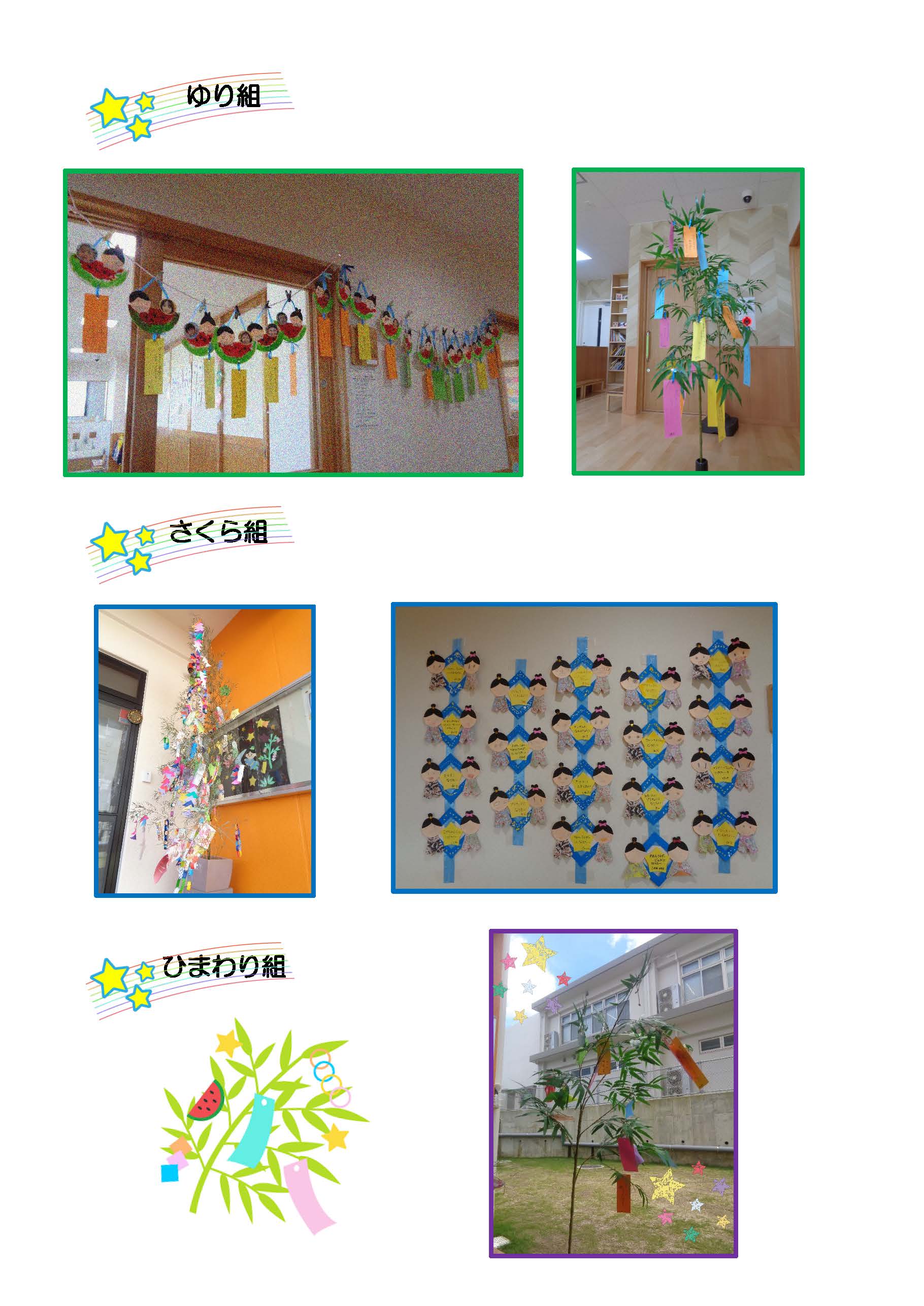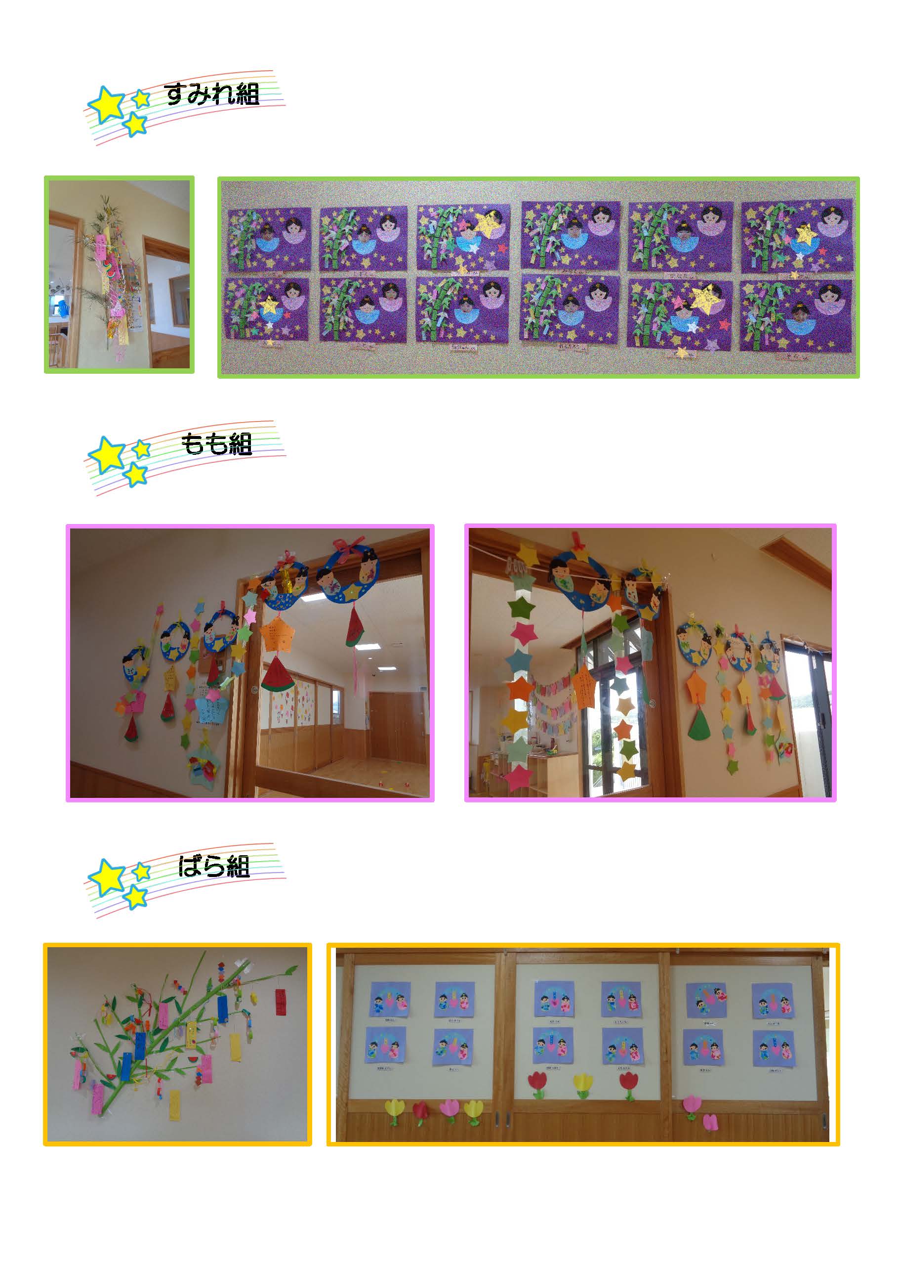7月7日(水)の七夕会は新型コロナウイルス感染拡大防止のため、各クラスで七夕の雰囲気を味わいました。子どもたちが七夕の製作をしたり、短冊にお願いごとを書いて笹に飾り付けをして、園内の壁や廊下に色鮮やかに飾りました。