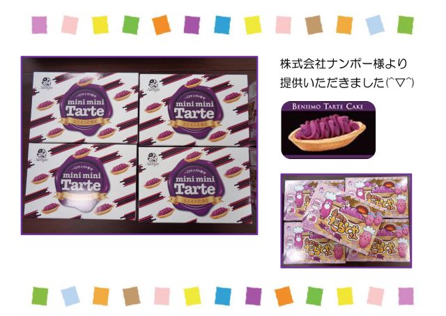 株式会社ナンポー様より子どもたちへ、べにいもタルトのお菓子とタルトを手作りできるキットをご提供いただきました。べにいもタルトはみんなで美味しくいただきました(*^-^*)